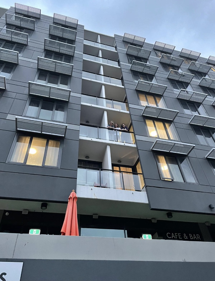 Then comes a quiet knock on the door. Aha! I open it to find a shopping bag just outside, full of salads and fruit and pastries. Smiles all around. I manage to message my sister, who’s standing by with a pre-planned suitcase full of books, games, Tim Tams and Vegemite – life’s essentials. Hastily adding some items to the list (milk, instant ramen, Shiraz) I fish out the phone chargers and we settle happily down for the night, only popping outside to wave down to my niece in a surreal moment after she delivers the suitcase of goodies to reception.