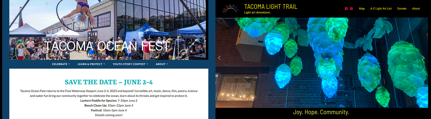 Recent work: Point Defiance Zoo & Aquarium, Northwest Trek Wildlife Park (complete content audit, rewrite, migration, updates), Tacoma Ocean Fest, Tacoma Light Trail (complete build, created all content, updates) and of course, the website you’re on now.