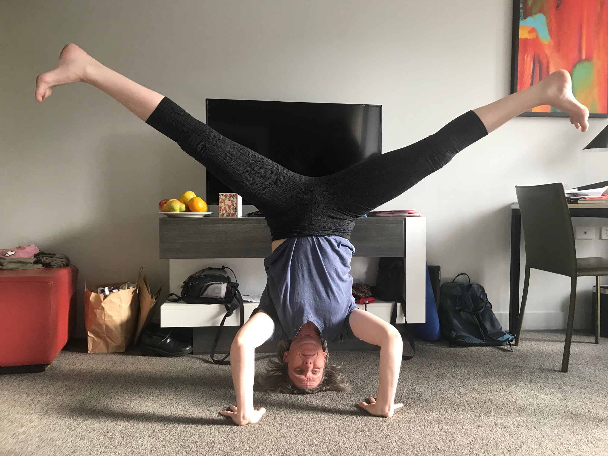 Another balcony flute session, and finally my scales are paying off. I whip through them, enticing a myna bird to the railing below, when suddenly I hear voices close by. And they’re not my kids. A little shocked, I look around, lean over the balcony to see next door. Nothing. Then I twist into a backbend and stare upwards. On the balcony above are a dad and his two little girls. I think they’re as surprised as I am, but we quickly recover and grin happily.